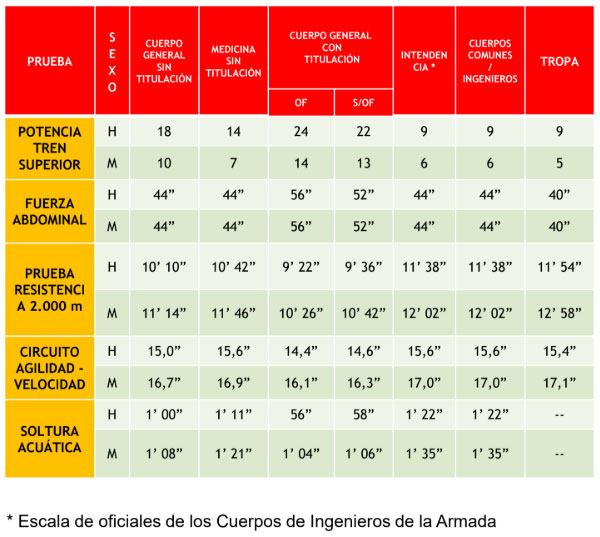 Prueba de soltura acuática: 50 metros libres natación. (Solamente para el acceso a las escalas de oficiales y suboficiales)